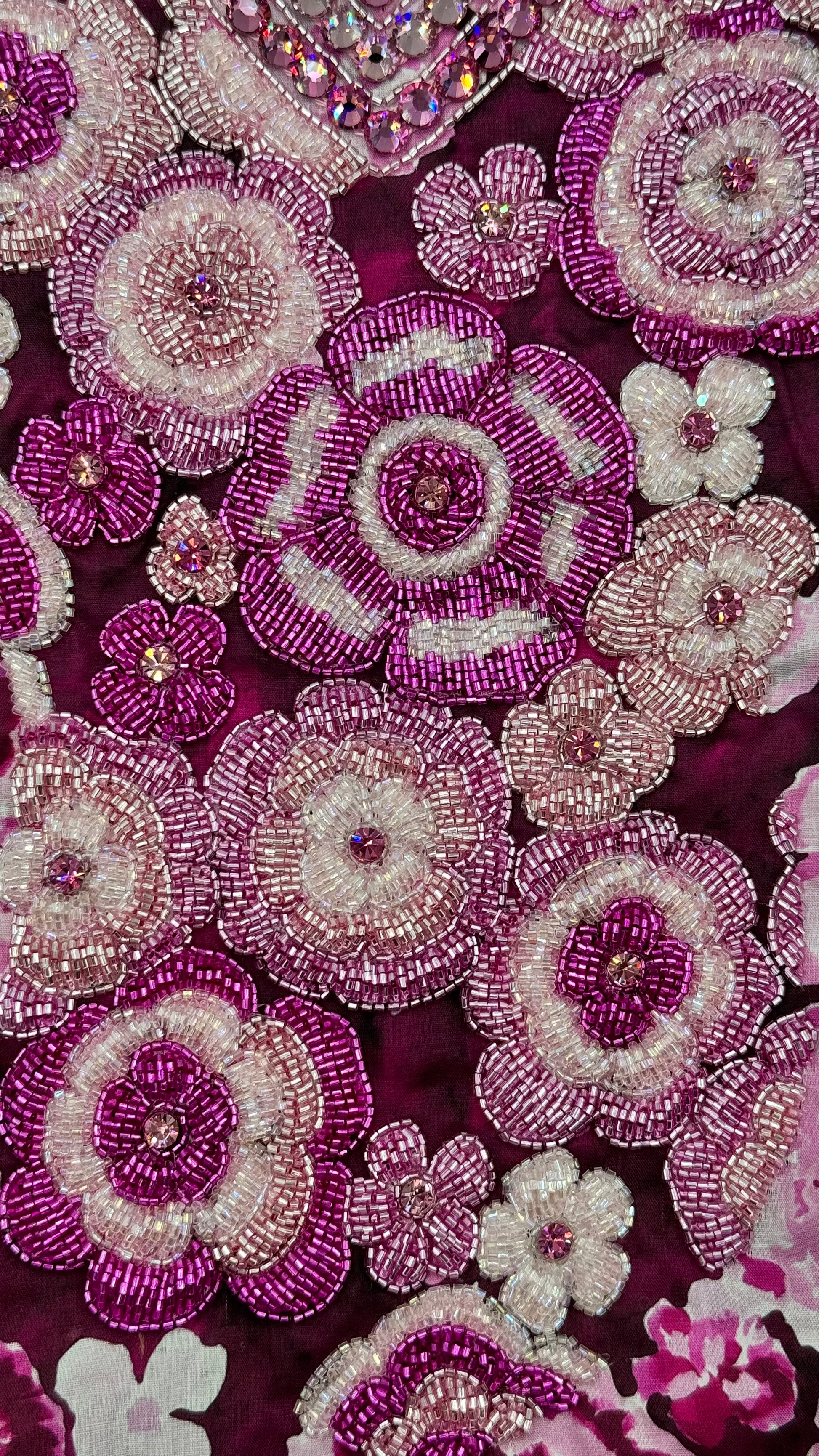 Delicate crystal neck embroidery adorned with Preciosa hot fix and chiton crystals couture hand-embroidered florals on cotton PREMIENSE Italian brand cotton
