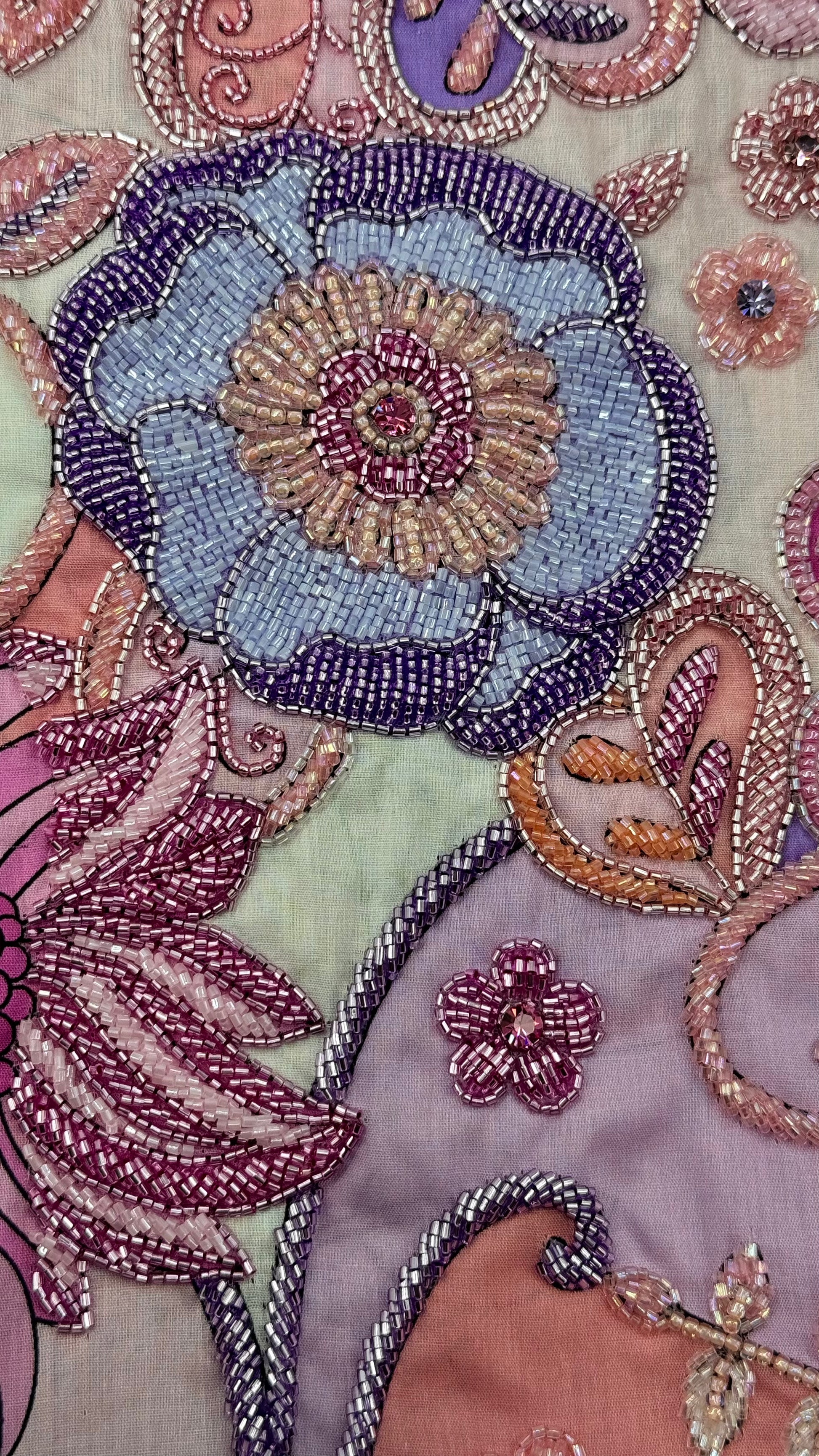 Delicate floral neck embroidery with Preciosa chaton crystals hand-embroidered flowers on cotton PREMIENSE Italian brand cotton