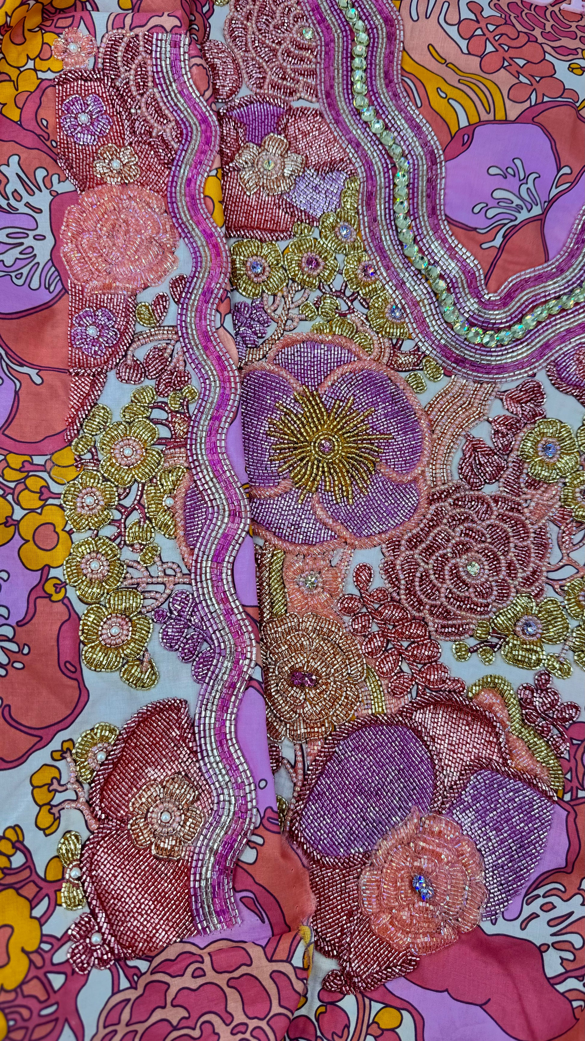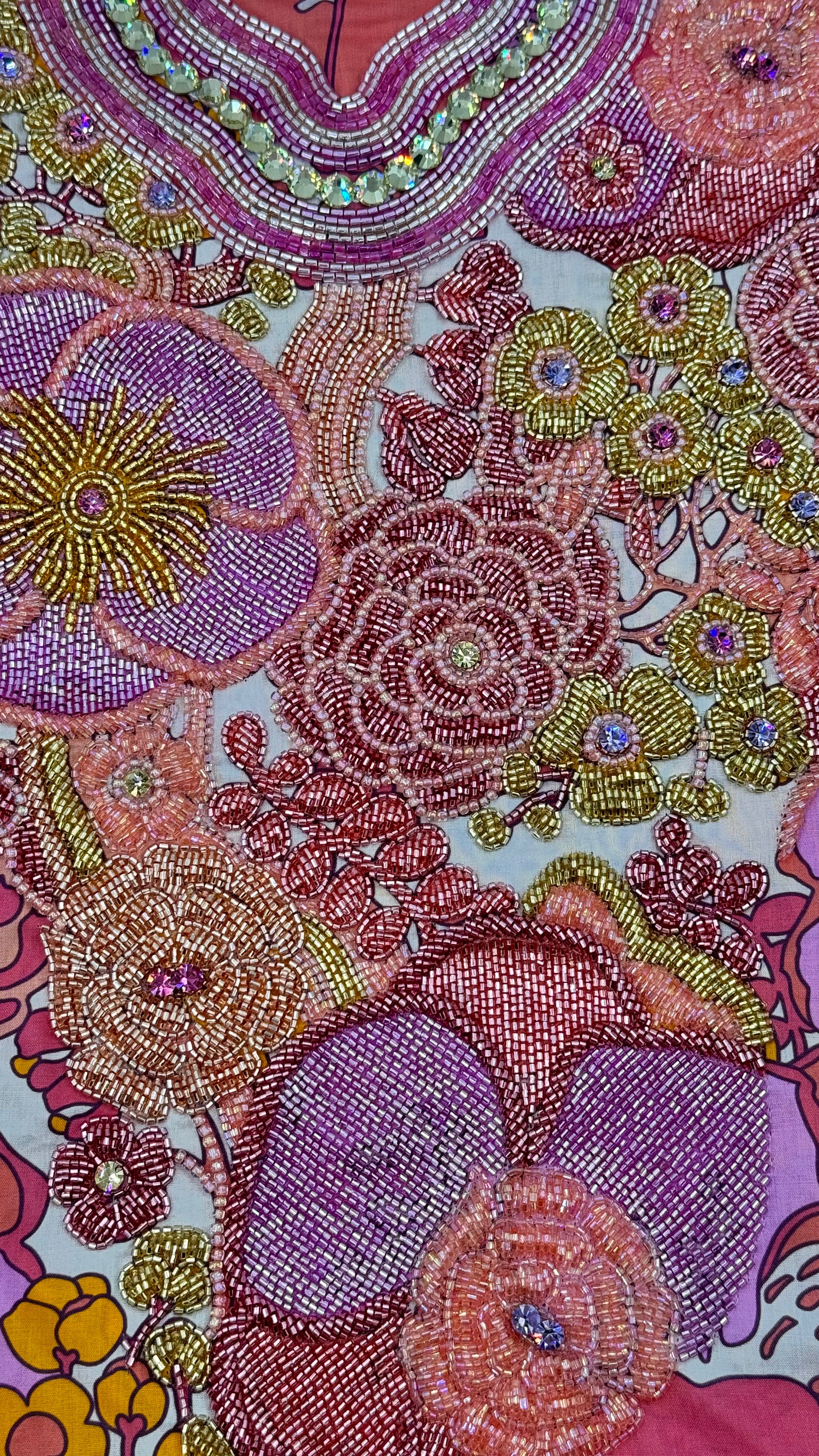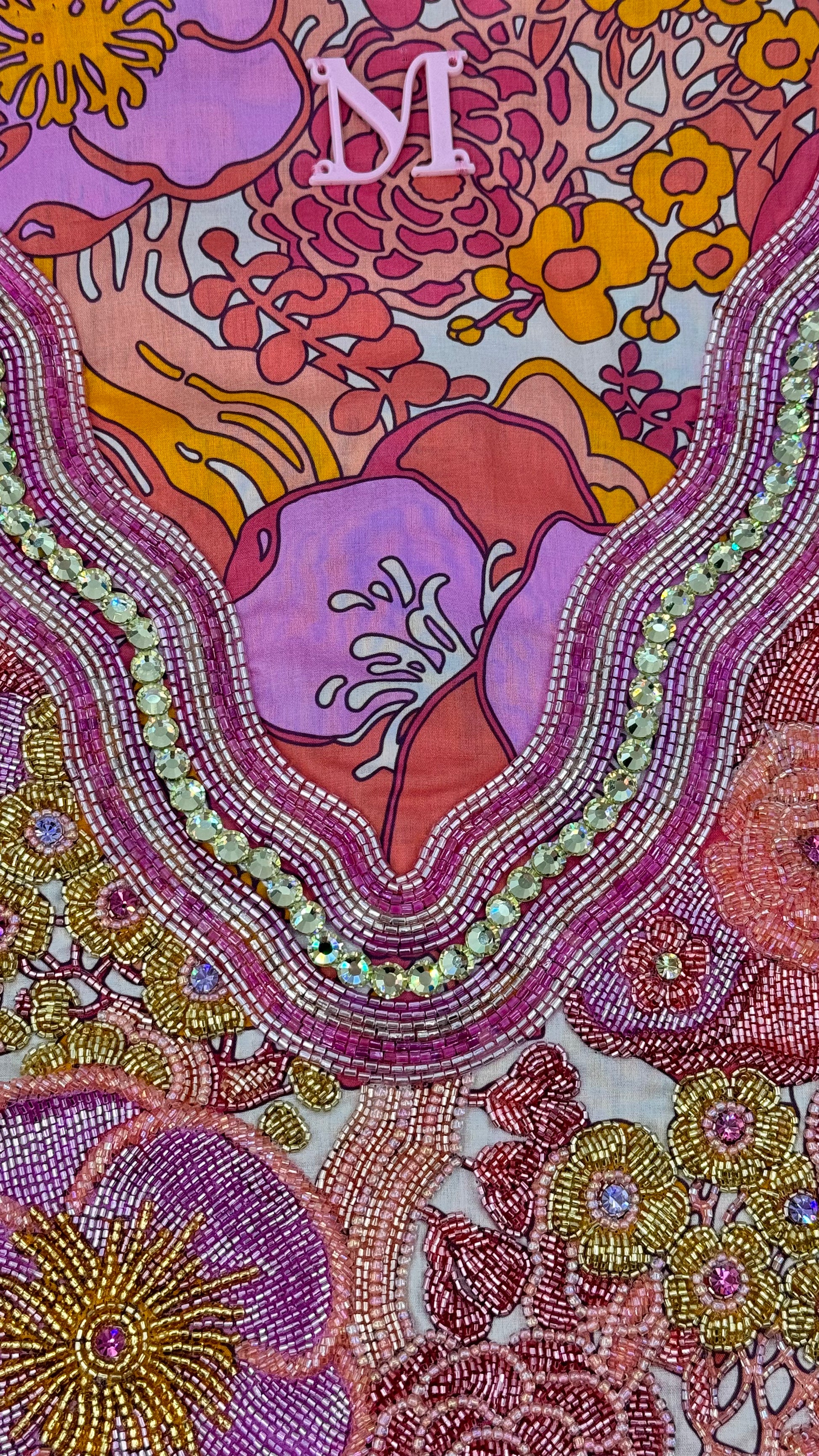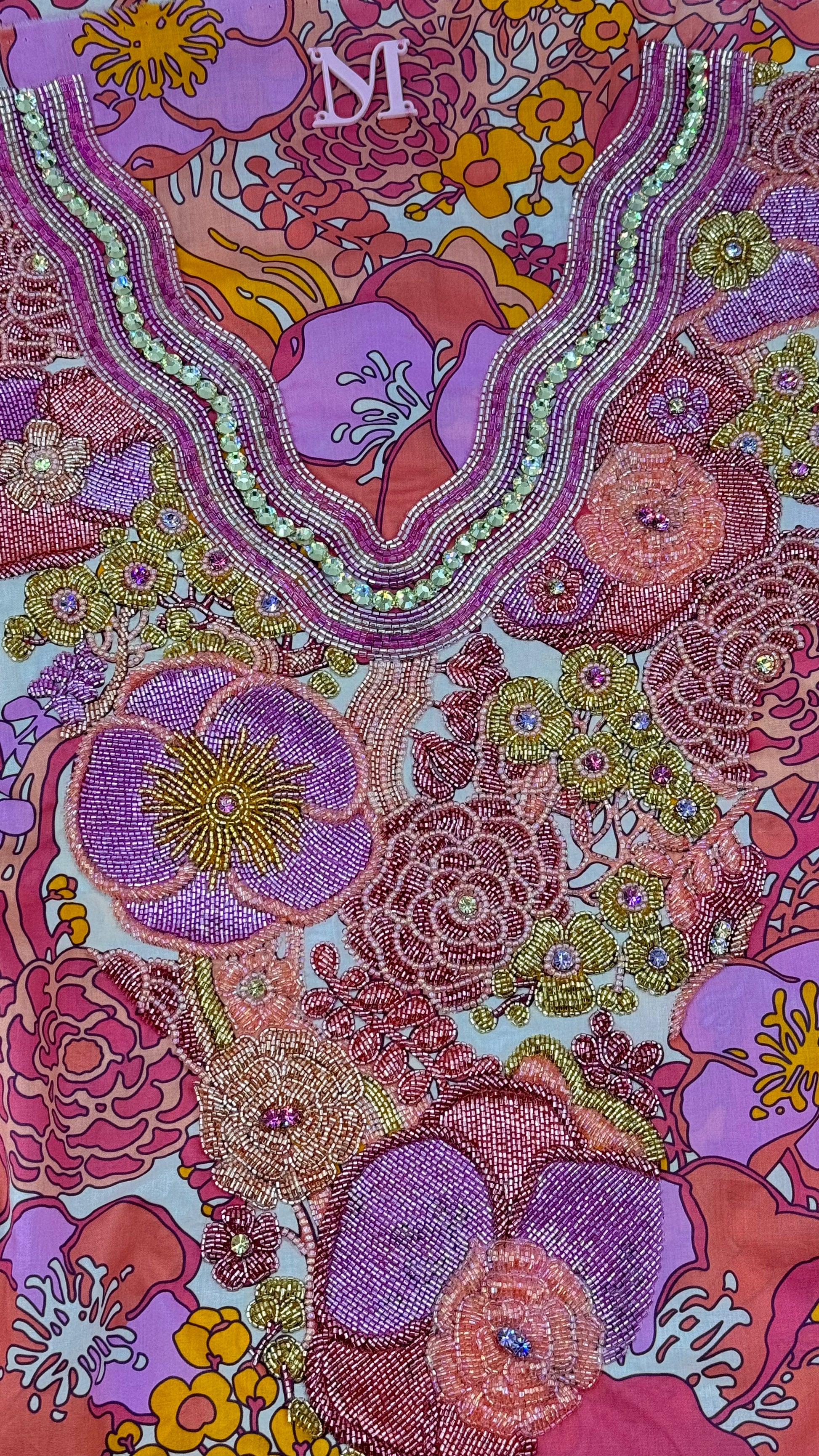 Delicate V neck wavy crystal neck embroidery adorned with Preciosa hot fix and chaton crystals couture hand-embroidered florals on cotton PREMIENSE Italian brand cotton